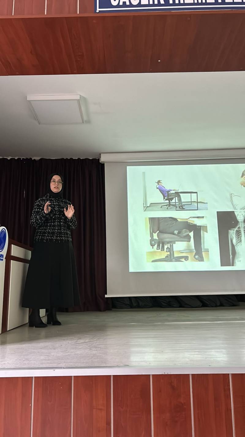 Fizyoterapist Aleyna Karakuş, seminer sırasında katılımcıların sorularını yanıtlayarak, skolyoz ve duruş bozuklukları konusunda farkındalık oluşturdu. Katılımın yoğun olduğu etkinlik, öğrencilere ve akademik personele faydalı bilgiler sunarak büyük ilgiyle takip edildi.