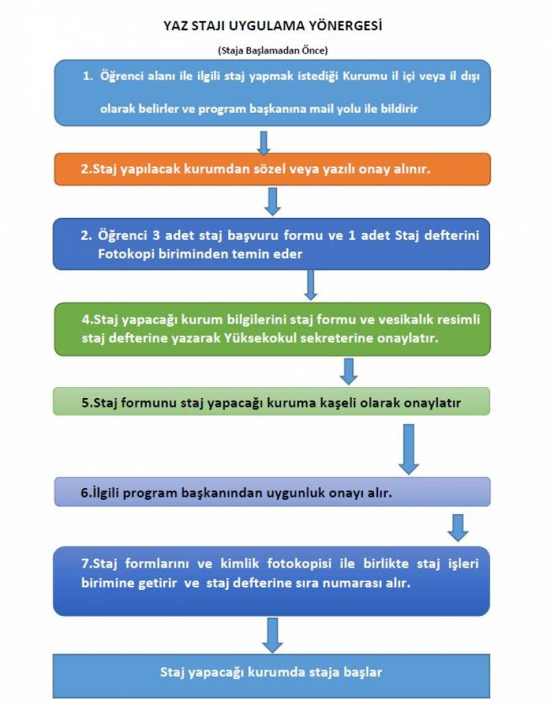 - Staj yapacağı kurum bilgilerini staj formu ve vesikalık resimli staj defterine yazarak Yüksekokul sekreterine onaylatır.